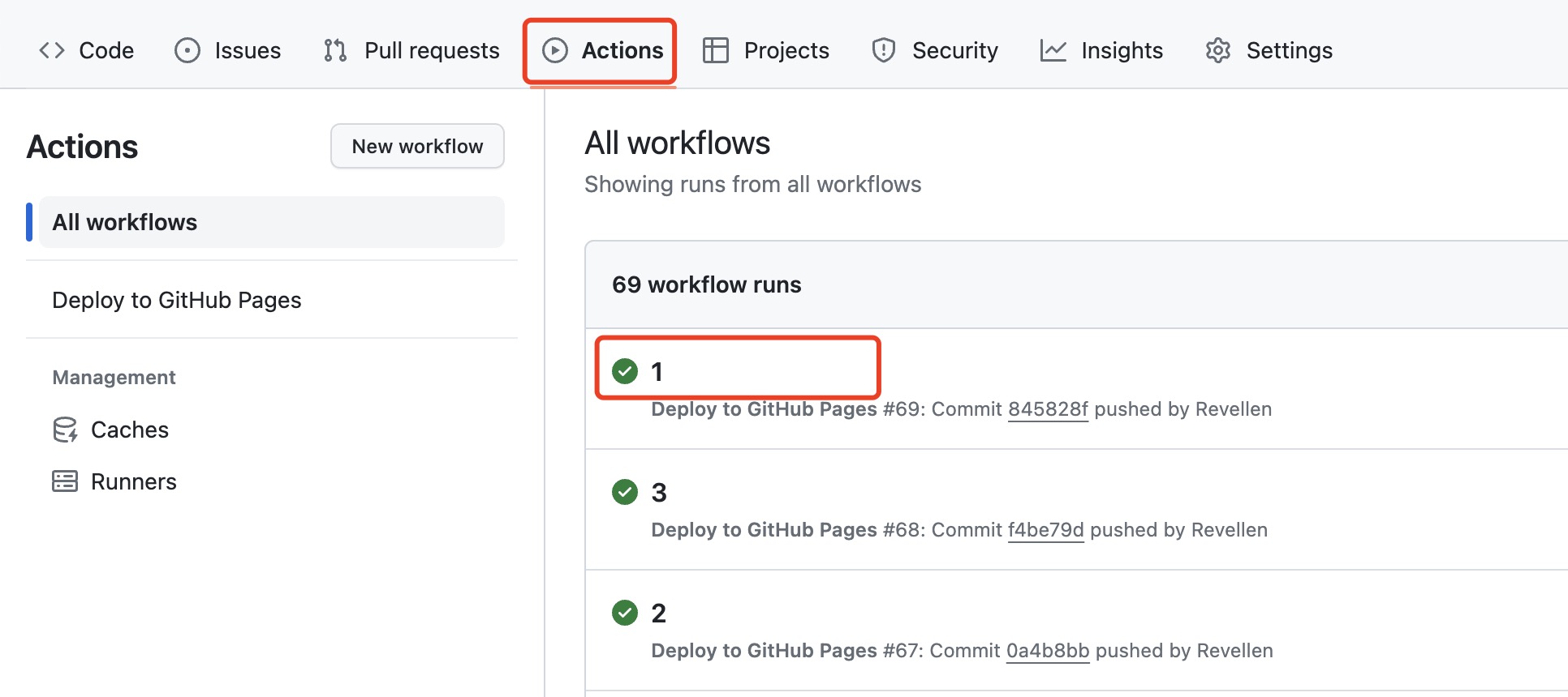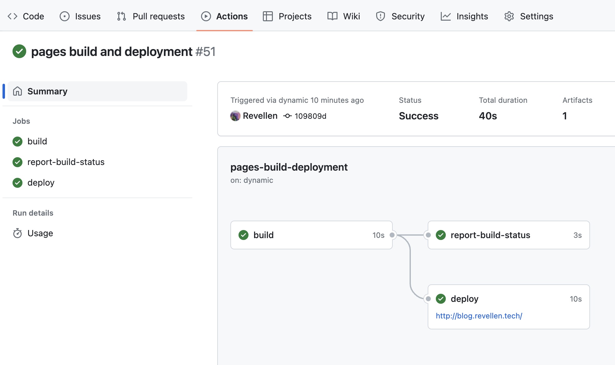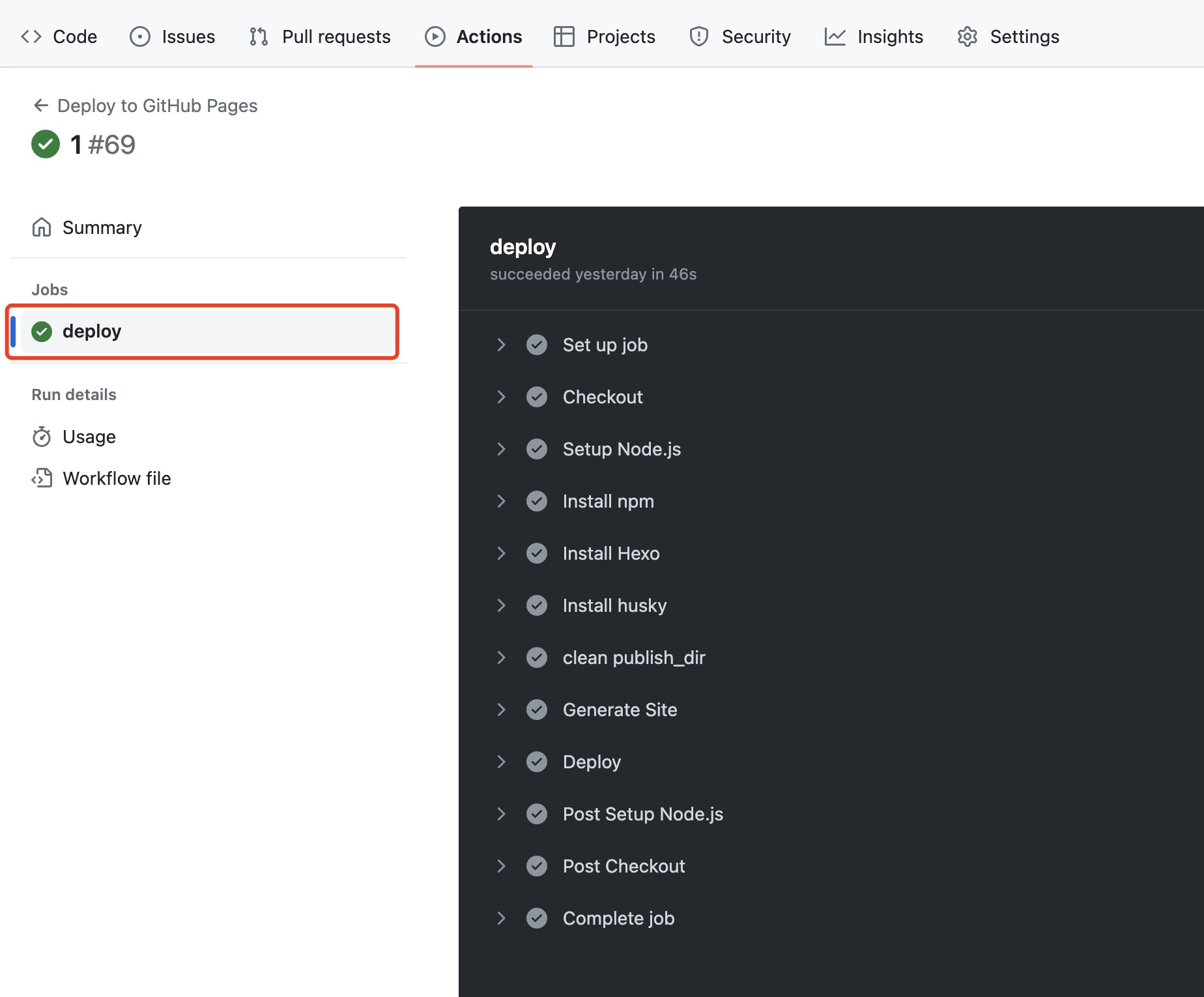 - 进入blog_src仓库,切换至Actions,可以看到workflow列表,点击列表中的名称(也即推送时所留下的comment),进入工作流实例页,可以在该页面查看任务的具体执行情况、debug内容等。若一切运转正常,执行完成后,任务流实例是Success的状态。