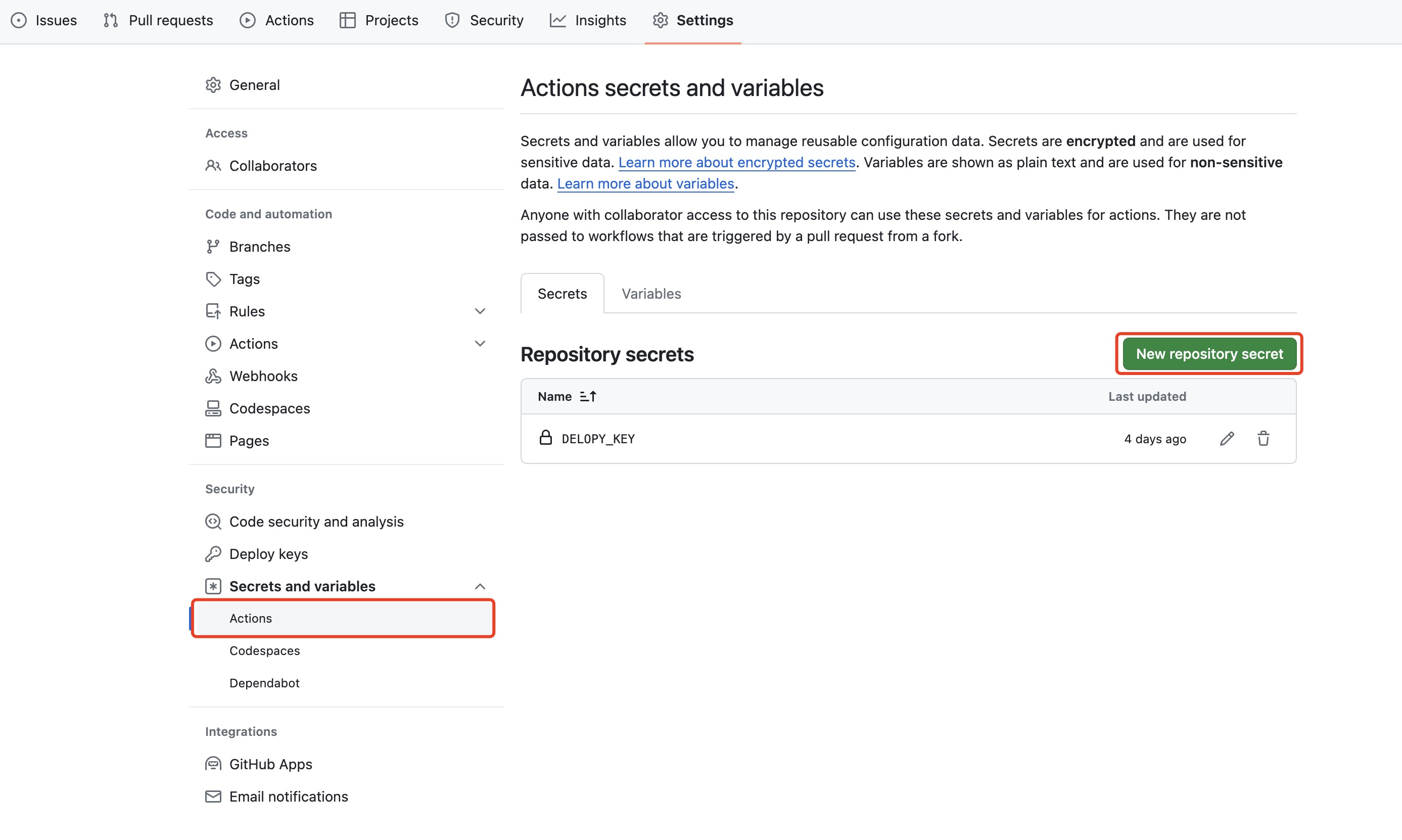 GitHub中,进入blog_src仓库,切换至Settings,在侧边栏Security分类下,找到并展开Secrets and Variables,选择Actions。